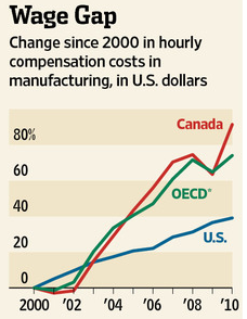 : “Wage and benefit costs at a Caterpillar rail-equipment plant in LaGrange, Ill., are less than half of those at the company’s locomotive-assembly plant in London, Ontario, Caterpillar says.”Dollar weakness had played a major role in helping to reduce US compensation cost levels – for example with respect to Canada.